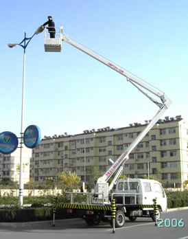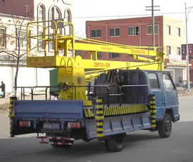 一種利用汽車引擎動力驅(qū)動的折臂式高空作業(yè)車。車輛的行走功能,使升降平臺有更好的靈活性和機動性,使高空作業(yè)效率更高。折臂結(jié)構(gòu)緊湊,采用新型型鋼,強度高,重量輕,架設速度快,工作臺既可升高又可水平延伸,還可旋轉(zhuǎn)360度,易于跨越障礙到達工作位置。